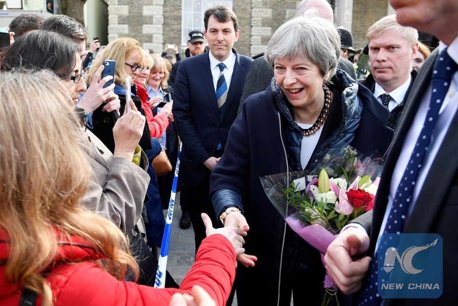 Britain's Prime Minister Theresa May (3R) meets members of the public during her visit to Salisbury, southern England, on March 15, 2018, where she visited the areas where former Russian double agent Sergei Skripal and his daughter Yulia went, and were discovered, following an apparent nerve agent attack on March 4. (Xinhua/AFP)