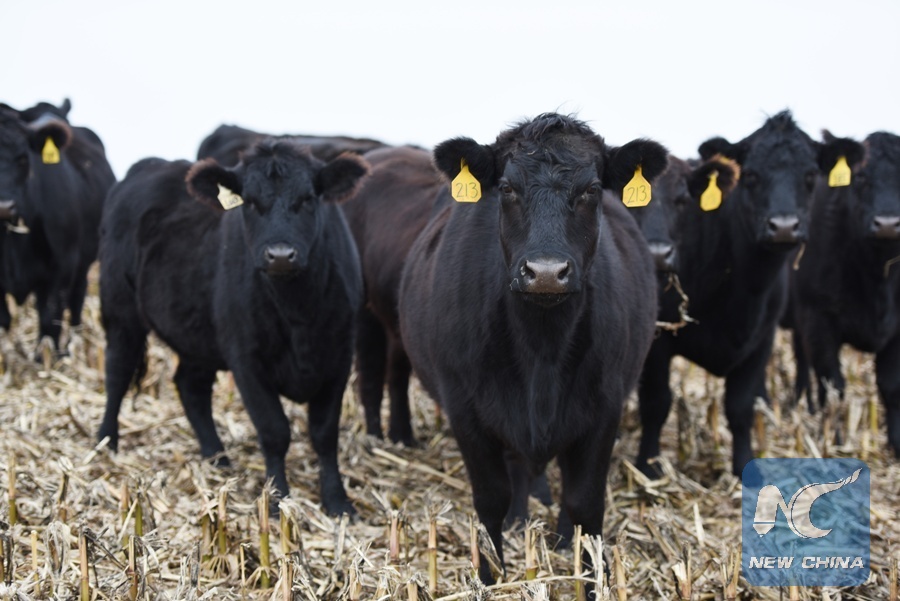 Photo taken on Oct. 31, 2017 shows Angus cows at Bill's farm in Omaha, the United States. Omaha is poised to become a household name in China since its Greater Omaha Packing company sent about 40 boxes of its products to China on June 14, soon days after the United States and China reached a deal to re-open Chinese markets for U.S. beef as part of their 100-day action plan to boost bilateral economic cooperation. (Xinhua/Han Fang)