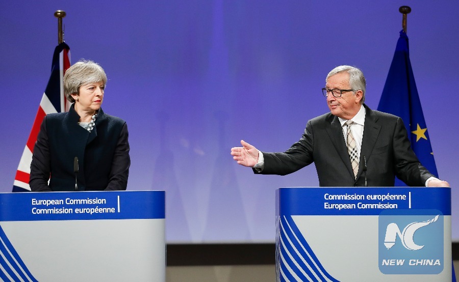 British Prime Minister Theresa May (L) and European Commission President Jean-Claude Juncker attend a press conference after their meeting on Brexit at EU headquarters in Brussels, Belgium, Dec. 4, 2017. (Xinhua/Ye Pingfan)