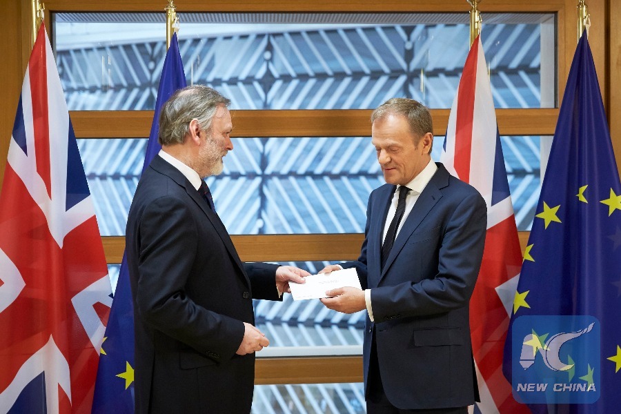 British Ambassador to the EU Tim Barrow (L) hands the Brexit letter to European Council President Donald Tusk in Brussels, Belgium, March 29, 2017. (Xinhua/European Union)