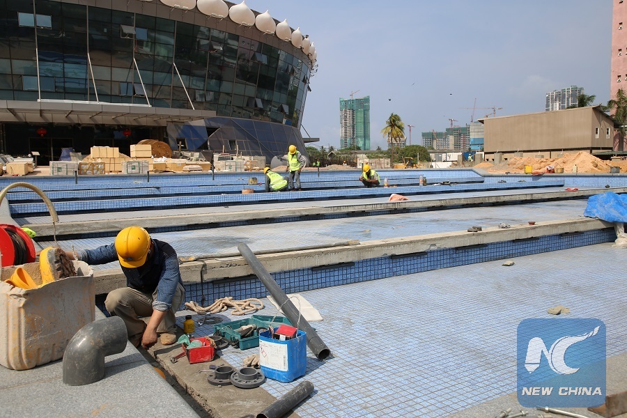 The workers of the Colombo Lotus Tower Project is working at the project site on March 31, 2018 in Colombo, capital of Sri Lanka.