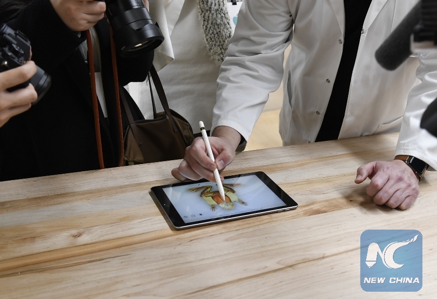 A customer experiences a new iPad in Chicago, the United States, on March 27, 2018. Apple on Tuesday introduced a new iPad with a digital pencil to draw and write plus greater performance in Chicago. (Xinhua Photo)