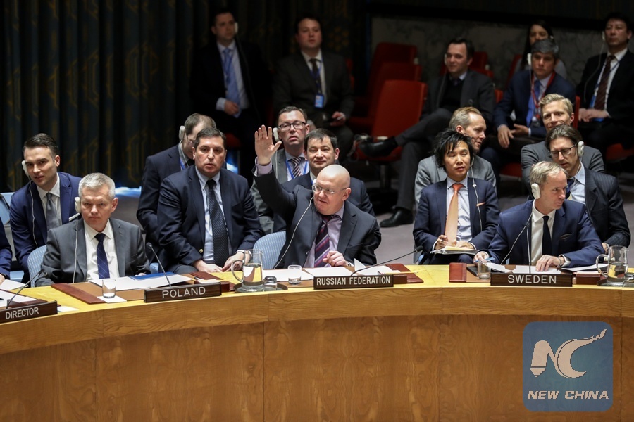 Russian Ambassador to the United Nations Vassily Nebenzia (C, Front) votes in favor of a Russian-drafted resolution on an investigation by the Organization for the Prohibition of Chemical Weapons (OPCW) into the alleged chemical attack in Douma, Syria, at the UN headquarters in New York, on April 10, 2018. The UN Security Council failed to adopt the Russian-drafted resolution on Tuesday. (Xinhua/Li Muzi)