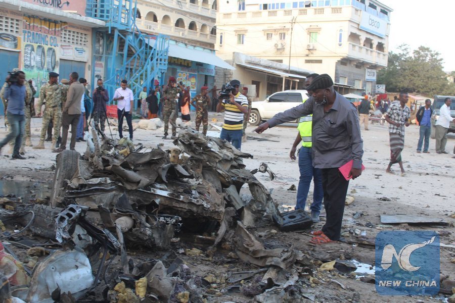 People are seen at the scene of car bomb blast in Mogadishu, Somalia, Sept. 28, 2017. At least seven people were killed and scores injured in a car bomb explosion which occurred alongside a densely-populated road near Hamarweyne market in Mogadishu on Thursday. (Xinhua/Faisal Isse)