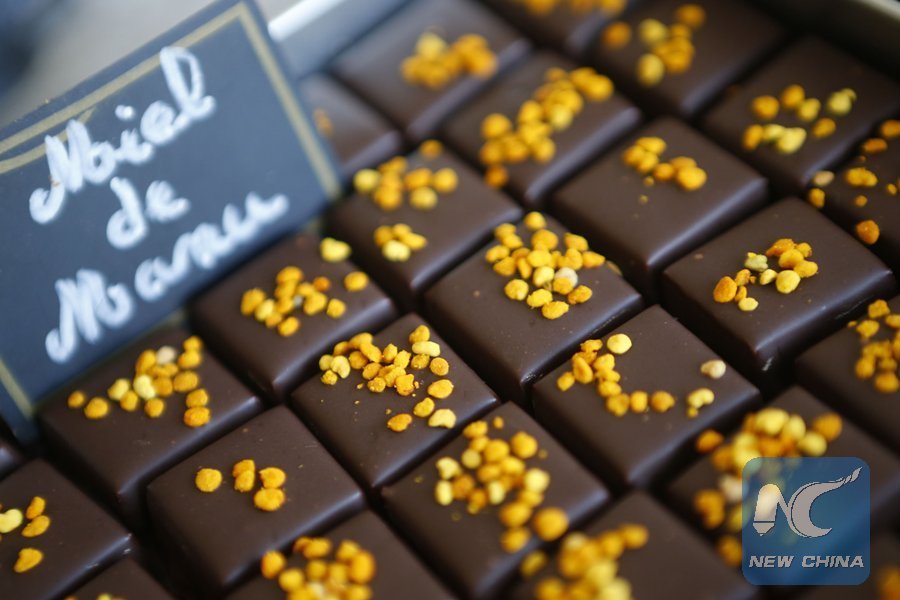 A picture taken on March, 30, 2018 shows honey chocolate made by prize-winning Corsican chocolate makers Josiane and Lionel Colomb-Bereni, at their factory in Peri on the French Mediteranean island of Corsica. (Xinhua/AFP)