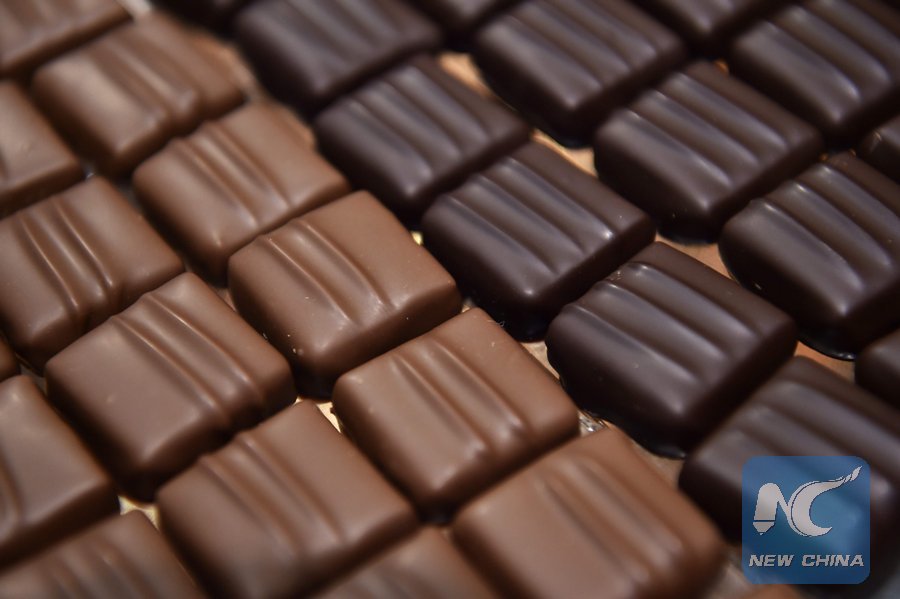 Pieces of milk and dark chocolate are displayed at the Salon du Chocolat (Chocolate Fair) in Paris, France, on Oct. 28, 2016. (Xinhua/AFP)