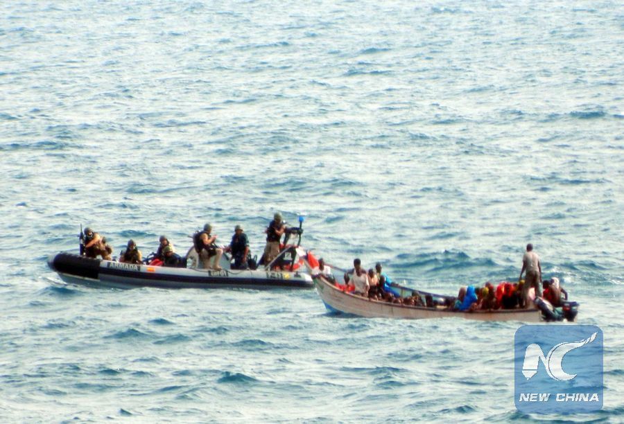 File photo shows crew members of Spanish Armada Vessel "Relampago" rescue 68 people who were drifting in a small boat, at the Gulf of Aden, the Indian Ocean, on Sept. 10, 2012. (Xinhua/AGENCIAPUNTOPRESS)