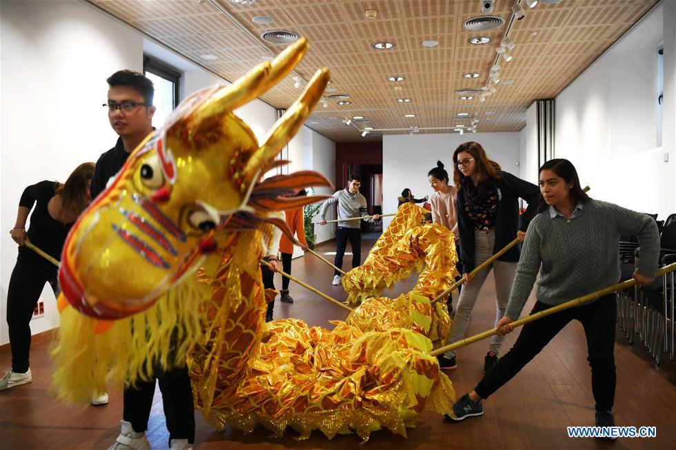 Students prepare for dragon dance at the Confucius Institute in Barcelona, Spain, on Feb. 15, 2018. In recent years, a surge in the learning of the Chinese language has been observed around the world. Confucius institutes and classrooms worldwide play an undeniable role in the process of bringing the Chinese language and culture closer to the international community.