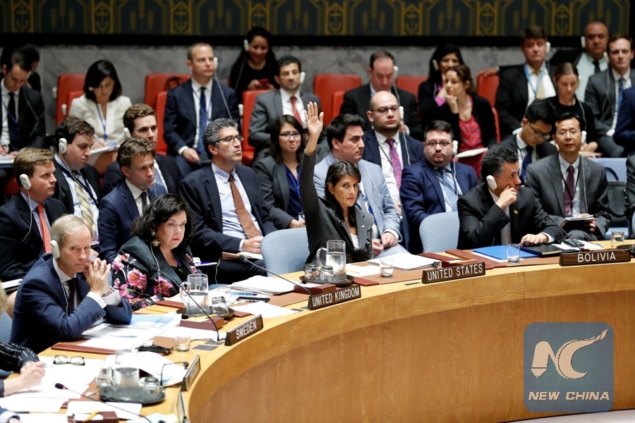 U.S. Ambassador to the United Nations Nikki Haley(2nd, right, front) votes in favor of a U.S. amendments to Kuwait draft on protection of Palestinians at the UN headquarters in New York June 1, 2018. (Xinhua/Li Muzi)
