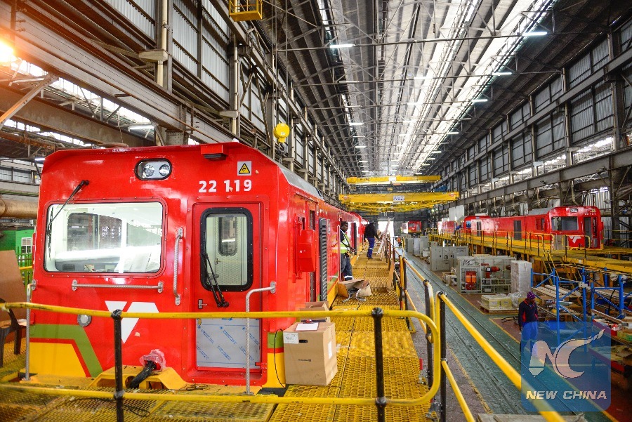 Working at the assembly workshop in the rolling stock center of Chinese rail transit equipment manufacturer CRRC, Vijayakumar Sundar, 40, occasionally recalls when he was a child and used blocks to build trains.