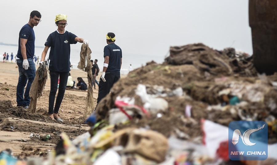 Volunteers collect plastic and other recyclable material at seaside in Mumbai, India, June 5, 2018. (Xinhua/Stringer)