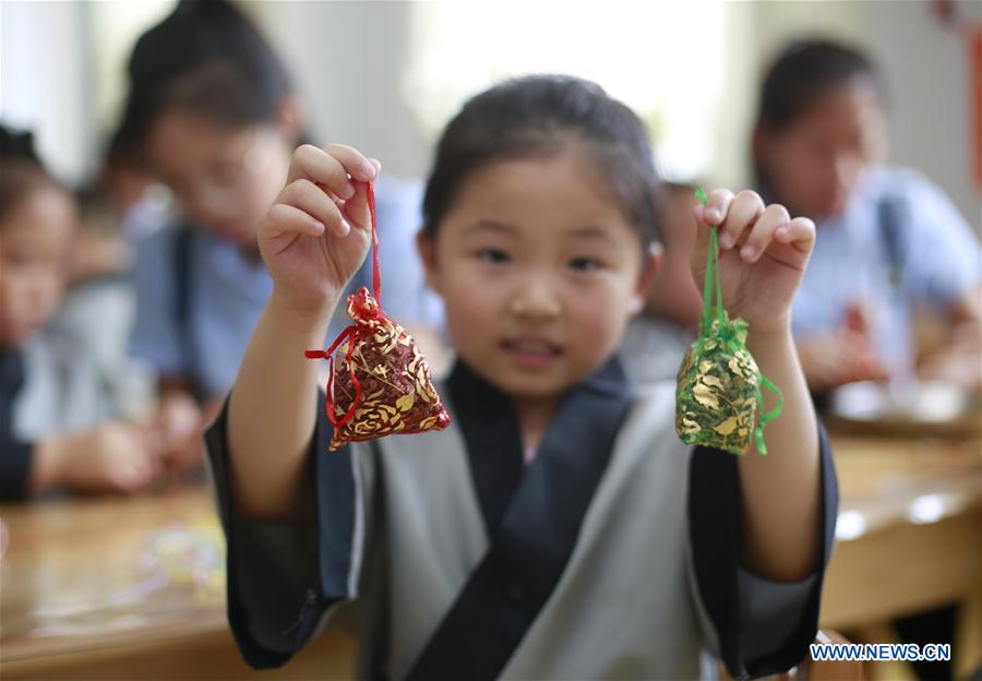 A child displays sachets during an activity to celebrate upcoming Dragon Boat Festival at Kunlun Qihang kindergarten in Hengshui City, north China's Hebei Province, June 15, 2018. (Xinhua/Zhu Xudong)