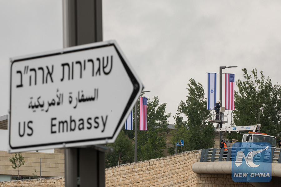Jerusalem municipal workers install U.S. and Israeli flags, as well as the U.S. embassy direction signs, near the U.S. Consulate General in Jerusalem, on May 7. (Xinhua/Ji Ni)