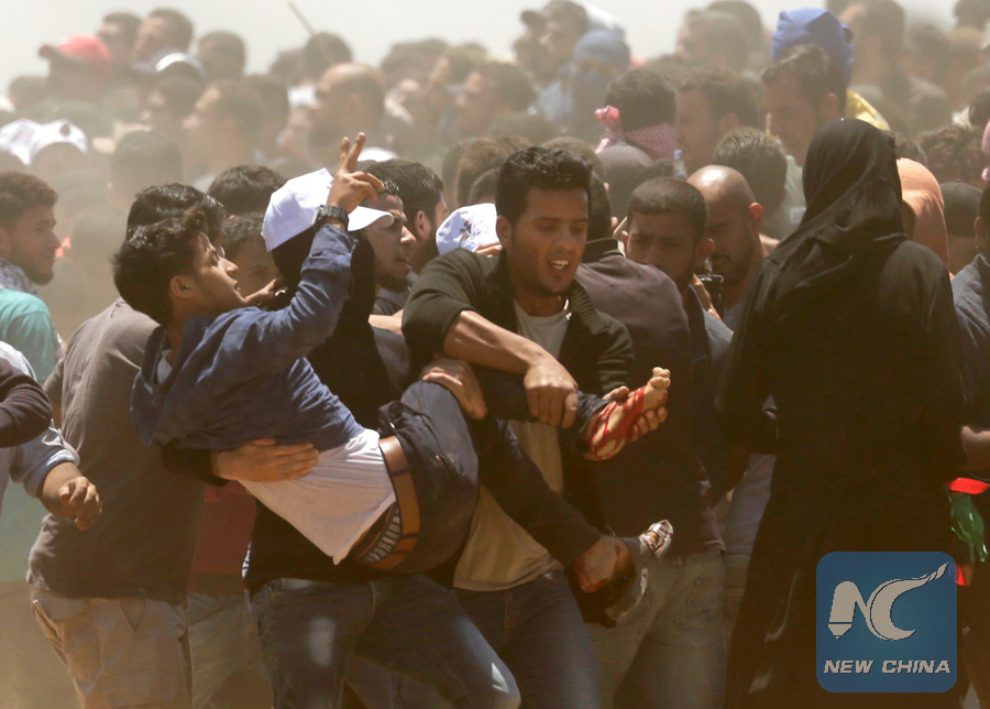 Palestinians carry a demonstrator injured during clashes with Israeli forces near the border between Gaza and Israel on May 14, as Palestinians protest over the inauguration of the U.S. embassy following its controversial move to Jerusalem. (AFP photo)