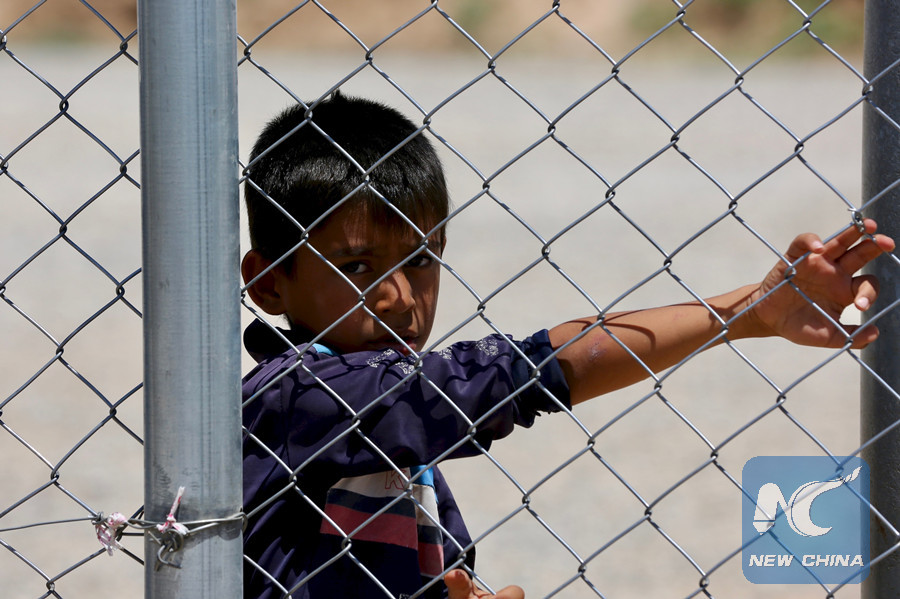 A boy looks out from Iraq's Hassan Sham refugee camp, established for internal displaced families mainly fleeing from Mosul, on July 7, 2018. (Xinhua/Khalil Dawood)