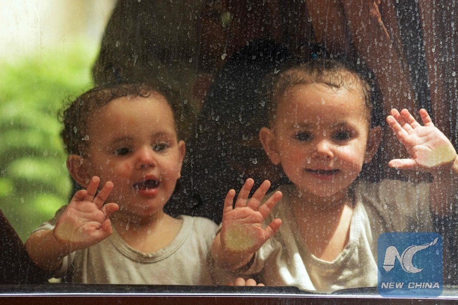 Syrian children look out of the window of a bus in Yalda on the outskirts of Damascus, as fighters and civilians from the areas of Yalda, Babila and Beit Sahem are evacuated to rebel-held area in northwestern Syria on May 5, 2018, under a negotiated withdrawal to secure the last opposition holdouts of the capital. (Xinhua/AFP)