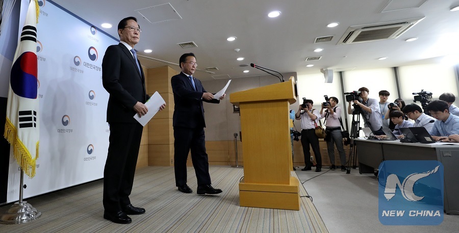 South Korean Defense Minister Song Young-moo (L) and Minister of Interior and Safety Kim Boo-kyum attend a joint press conference in Seoul, South Korea, July 10, 2018. (Xinhua/NEWSIS)