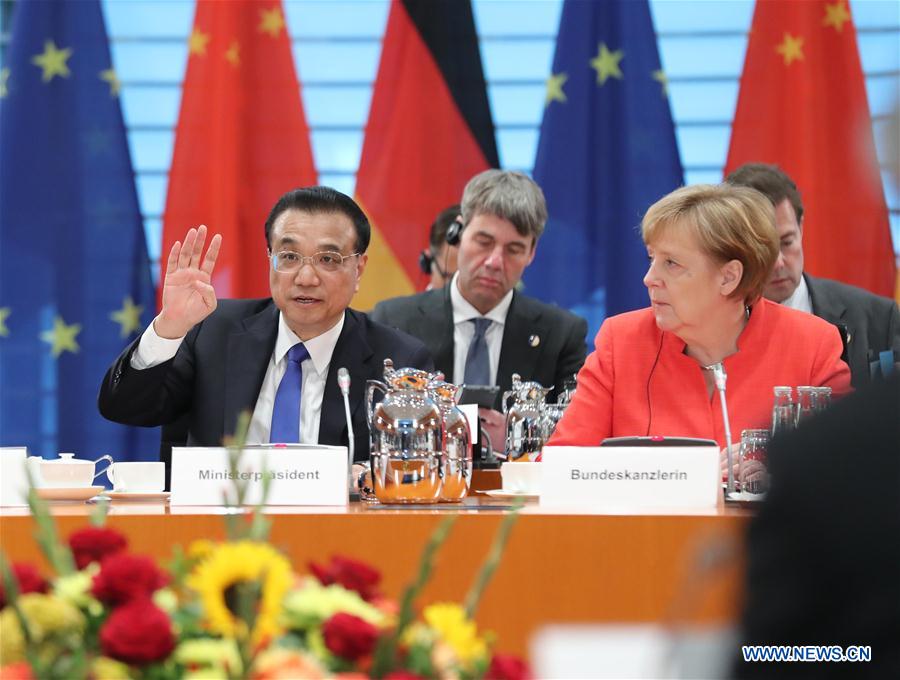 Chinese Premier Li Keqiang and German Chancellor Angela Merkel co-chair the fifth round of intergovernmental consultations in Berlin, Germany, July 9, 2018. (Xinhua/Liu Weibing)
