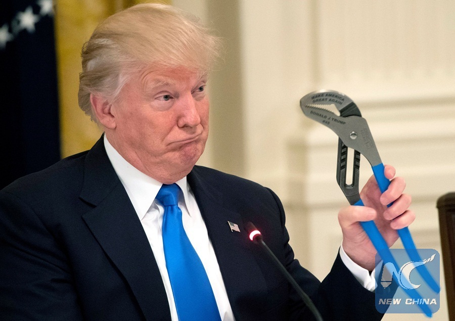 In this file photo taken on July 19, 2017, U.S. President Donald Trump holds up a pair of pliers as he speaks during a Made in America event with U.S. manufacturers in the East Room of the White House in Washington, DC. (Xinhua/AFP PHOTO)