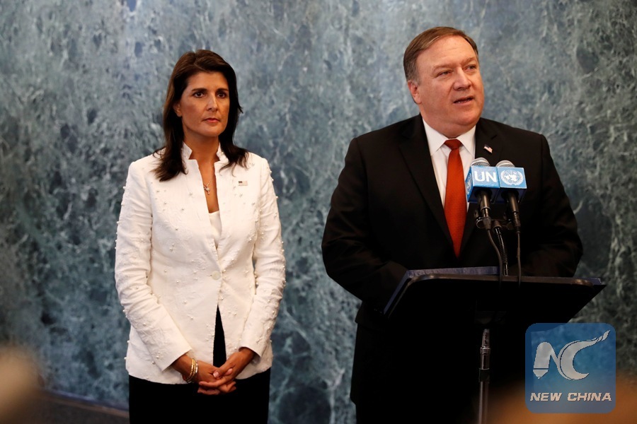 U.S. Secretary of State Mike Pompeo (R), accompanied by U.S. Ambassador to the United Nations Nikki Haley, speaks to the press at the UN headquarters in New York, July 20, 2018. (Xinhua/Li Muzi)