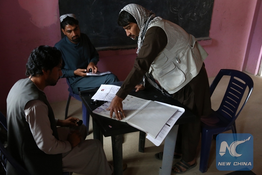 An Afghan man (R) uses his thumb to mark his application at a voter registration center in Ghazni city, capital of Ghazni province, eastern Afghanistan, May 21, 2018. (Xinhua/Sayed Mominzadah)