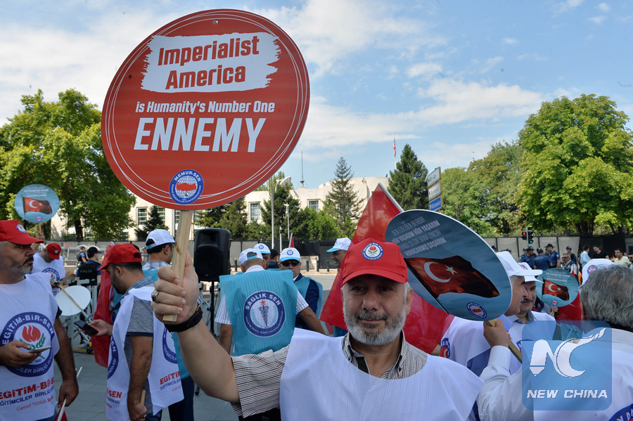 ANKARA, Aug. 3 (Xinhua) -- The ties between Turkey and the U.S. were once again strained by the rare U.S. sanctions on two Turkish ministers over Ankara's refusal to release detained U.S. pastor Andrew Brunson.