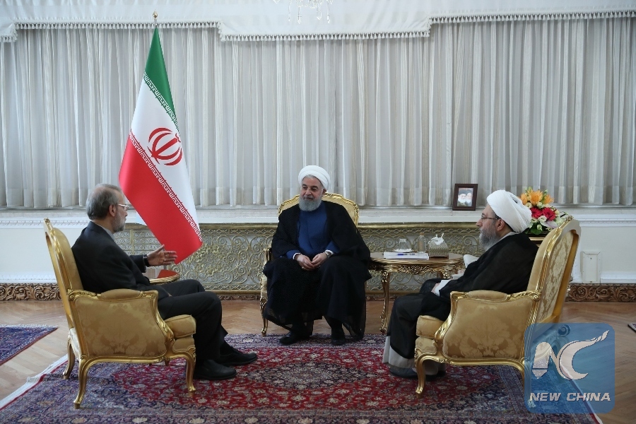 A handout picture provided by the Iranian presidency shows Iranian judiciary chief Sadegh Larijani (R), Iranian president Hassan Rouhani (C) and parliament speaker Ali Larijani (L) during a a meeting in Tehran on July 14, 2018. (Xinhua/AFP PHOTO)