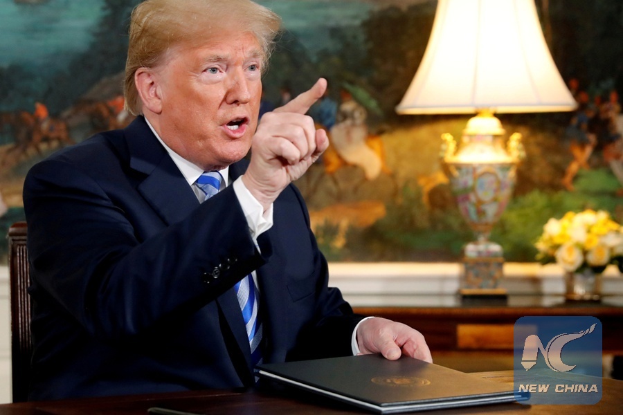 FILE PHOTO: U.S. President Donald Trump speaks to reporters after signing a proclamation declaring his intention to withdraw from the JCPOA Iran nuclear agreement in the Diplomatic Room at the White House in Washington, U.S. May 8, 2018. (Xinhua/REUTERS)