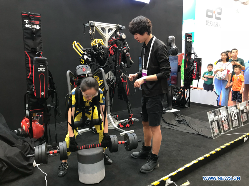 A visitor experiences a robot at the 2018 World Robot Conference in Beijing, Aug. 17, 2018. The conference attracts a total of 166 domestic and international enterprises exhibiting their cutting edge technologies and more than 500 items are displayed at the scene. (Xinhuanet/Liang Yurou)