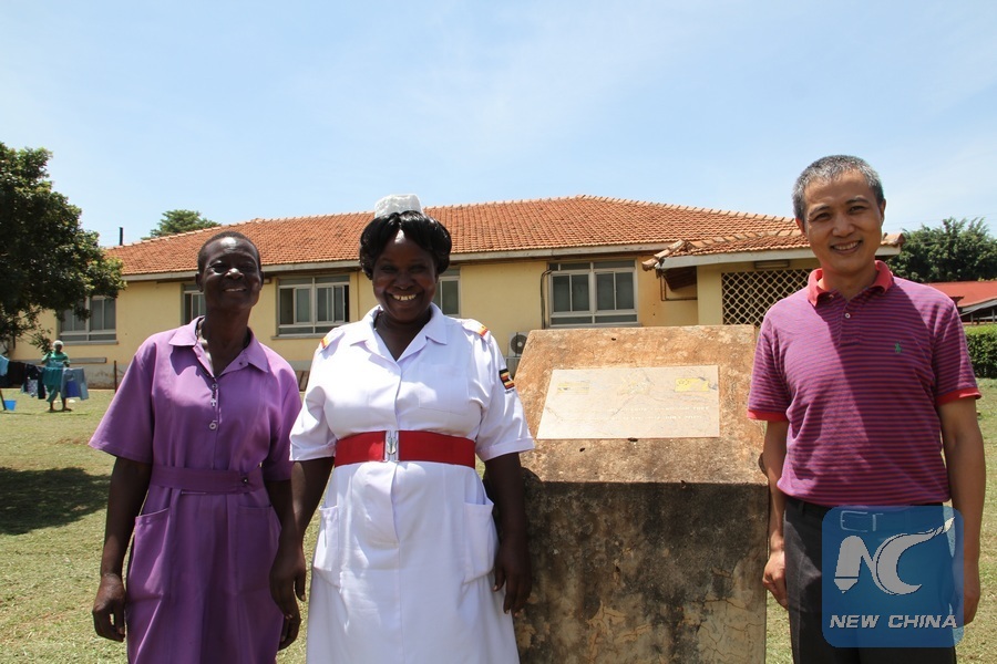 Cong Linhai (R), head of 18th Chinese medical team and nurse Rose Kawuma(L) and Jesca Namugoya pose for a group photo next to the monument of the Sino-Ugandan Friendship Tree at Jinja Regional Referral Hospital in eastern Uganda, Aug. 14, 2018. (Xinhua/Zhang Gaiping)