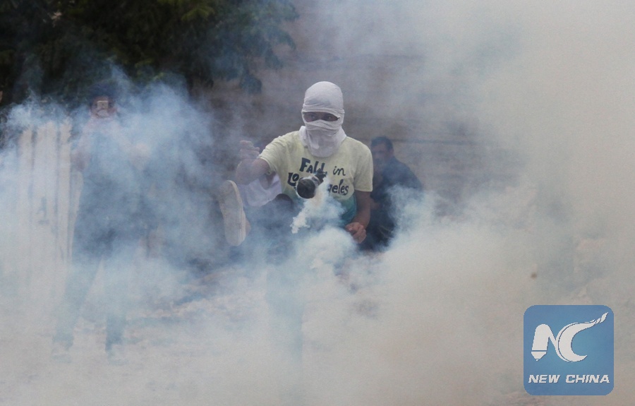 A Palestinian protester kicks back a tear gas canister during clashes after a protest against the expanding of Jewish settlements in Kufr Qadoom village near the West Bank city of Nablus, on Aug. 3, 2018. (Xinhua/Nidal Eshtayeh)