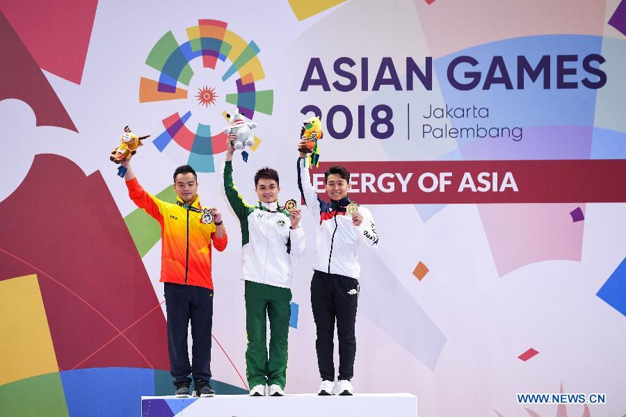 Gold medalist Huang Junhua (C) of China's Macao, silver medalist Pham Quoc Khanh (L) of Vietnam and Lee Yongmun of South Korea pose during the awarding ceremony of the Men's Nanquan & Nangun All-Round match at the 18th Asian Games in Jakarta, Indonesia, Aug. 21, 2018. (Xinhua/Cheong Kam Ka)