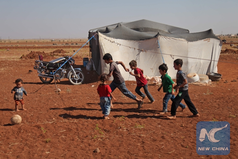 Syrian children play with a ball outside a tent at a camp for displaced civilians fleeing from advancing Syrian government forces, close to a Turkish military observation point near the village of Surman in the rebel-held northwestern Idlib province on Sept. 5, 2018. (Xinhua/AFP)