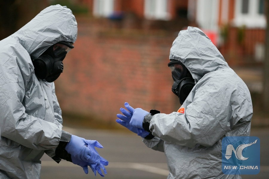 File Photo: Military personnel wearing protective coveralls work to remove vehicles from a cordoned off area behind a police station in Salisbury, southern England, on March 11, 2018, as investigations and operations continue in connection with the major incident sparked after a man and a woman were apparently poisoned in a nerve agent attack a week ago. (Xinhua/AFP)