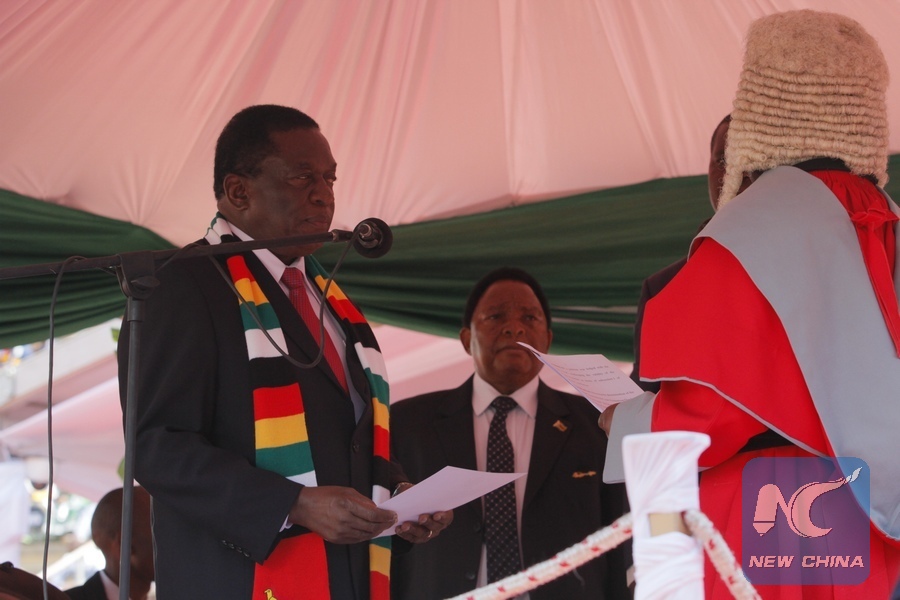 President of Zimbabwe Emmerson Mnangagwa (L) takes the oath on his inauguration at the National Sports Stadium in Harare, Zimbabwe, Aug. 26, 2018. Emmerson Mnangagwa was on Sunday sworn in for his first five-year term as the President of Zimbabwe by Chief Justice Luke Malaba. (Xinhua/Zhang Yuliang)