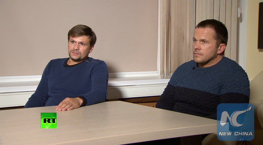 MOSCOW, Sept. 13 (Xinhua) -- Two individuals claiming they were the suspects in the former Russian spy poisoning case appeared on television Thursday denying they were guilty.