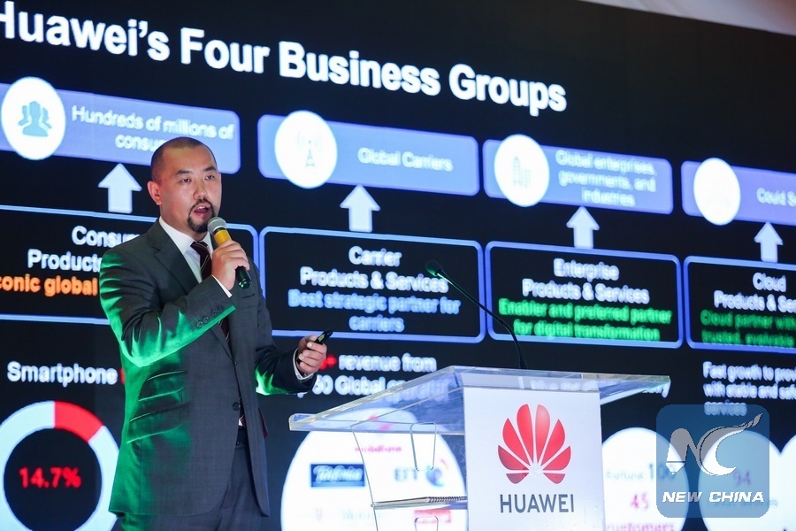 Chief Executive Officer of Huawei Technology Kenya addresses participants during the launch of Huawei-Redington partnership framework in Nairobi, capital of Kenya, Sept. 19, 2018. (Xinhua/Charles Onyango)