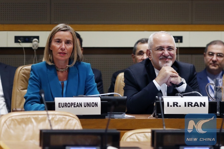 European Union (EU)'s foreign and security policy chief Federica Mogherini (L, front) and Iranian Foreign Minister Mohammad Javad Zarif (R, front) react during a meeting of foreign ministers from Iran, Britain, China, France, Germany and Russia at the UN headquarters in New York, Sept. 24, 2018. (Xinhua/Li Muzi)