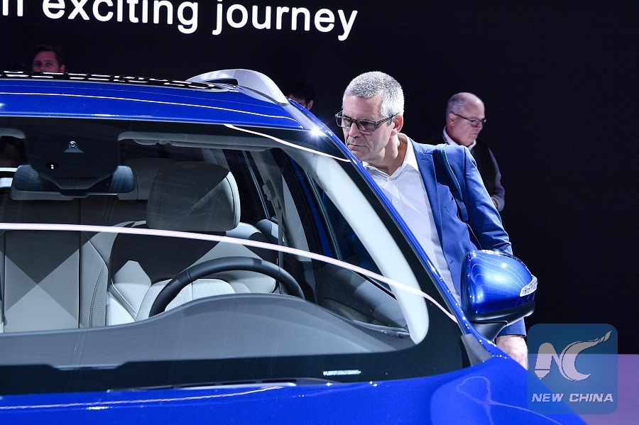 A visitor looks at a Chinese GAC Motor's GS5 SUV during its premiere at a media preview of 2018 Paris Motor Show in Paris, France, on Oct. 2, 2018. The Paris Motor Show will be open to the public from Oct. 4 to 14. (Xinhua/Chen Yichen)