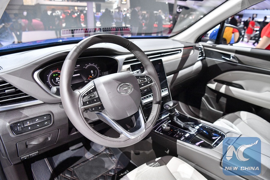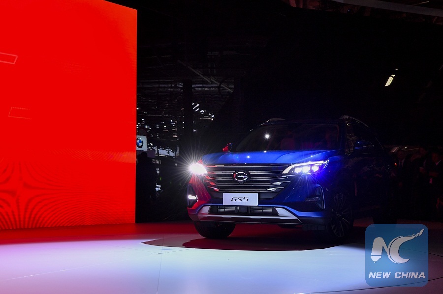 Photo taken on Oct. 2, 2018 shows a Chinese GAC Motor's GS5 SUV during its premiere at a media preview of 2018 Paris Motor Show in Paris, France. The Paris Motor Show will be open to the public from Oct. 4 to 14. (Xinhua/Chen Yichen)