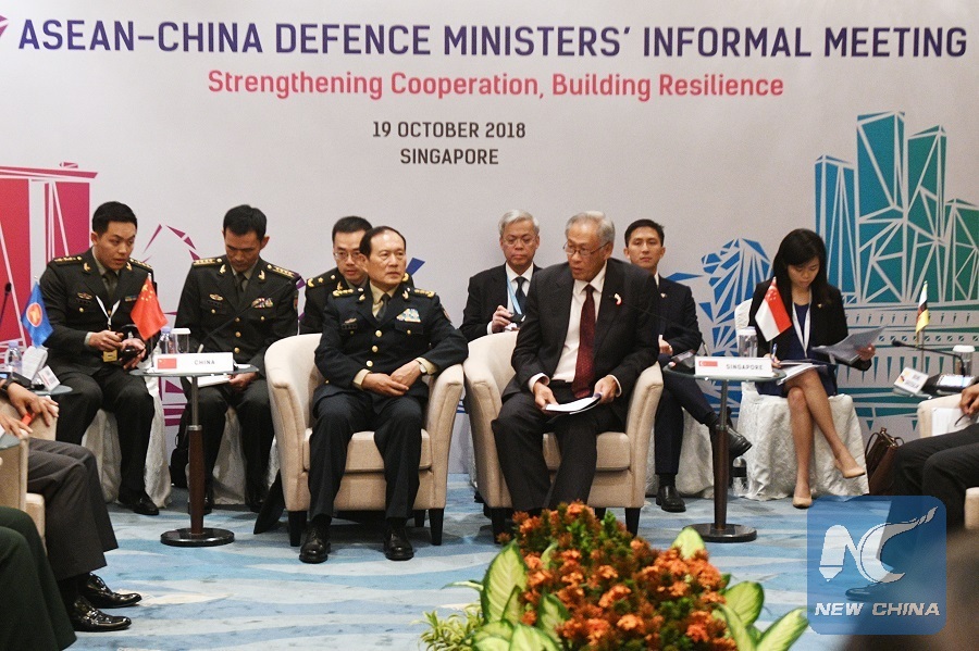 Chinese State Councilor and Minister of National Defense Wei Fenghe (L, Front) attends the 9th China-ASEAN Defense Ministers' Informal Meeting inSingapore, on Oct. 19, 2018. (Xinhua/Then Chih Wey)