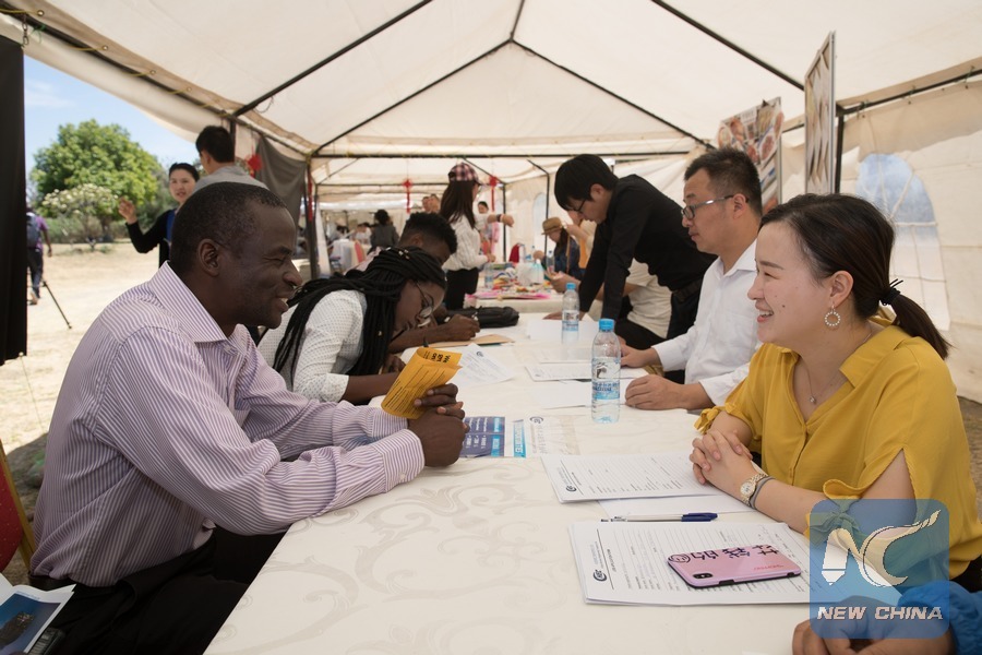 Representatives of Chinese enterprises talk with job seekers during a jobs expo at the University of Zambia in Lusaka, Zambia, Oct. 26, 2018. Zambia's Confucius Institute at the University of Zambia on Friday held a jobs expo where Chinese firms based in the southern African nation showcased themselves and tried to lure students to join them. (Xinhua/Peng Lijun)