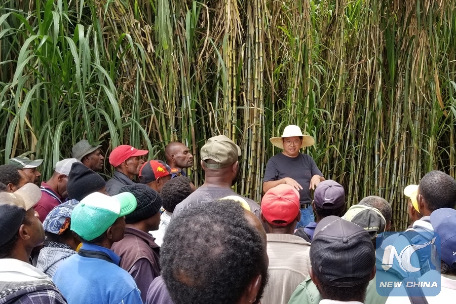 Lin Yingxing, a Chinese expert, shows villagers how to plant Juncao at the Goroka Juncao & Dry-land Rice Technology Demonstration Base in Papua New Guinea's Eastern Highlands Province (EHP). (Xinhua/Mo Huaying)