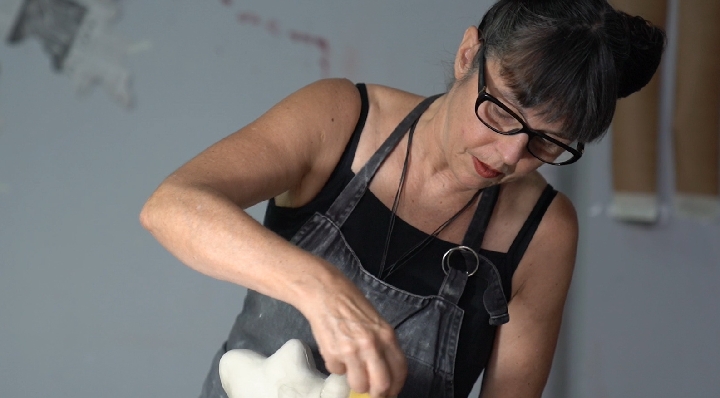 Ceramic artist Christiane Toewe from Germany works in a workshop. (Xinhua/Zhou Mi)