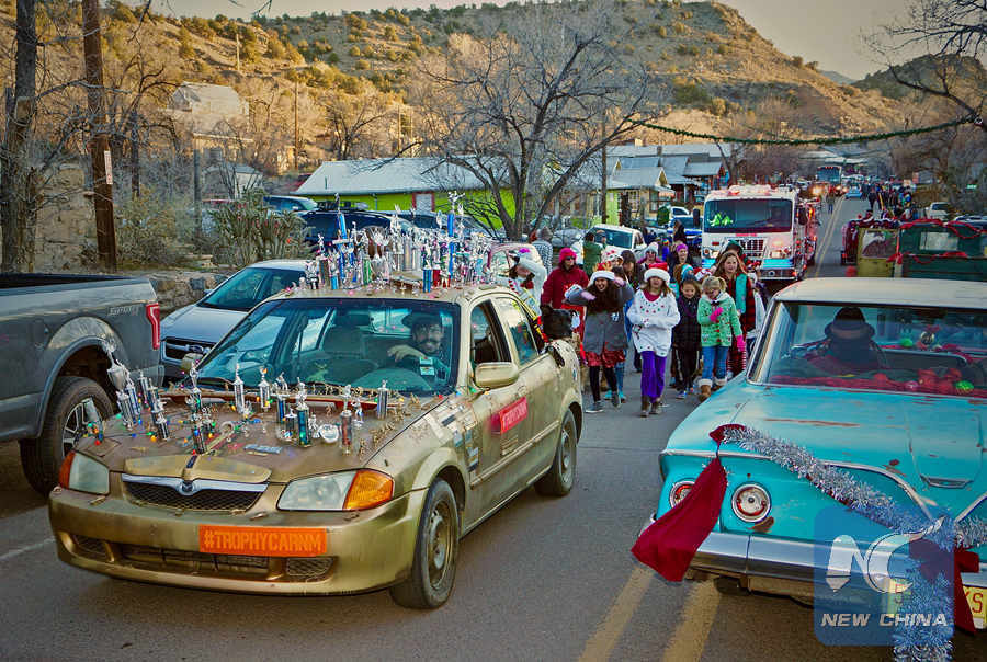 People participate in an annual Christmas parade in a small town of Madrid, New Mexico, the United States on Dec. 1, 2018. (Xinhua/Richard Lakin)