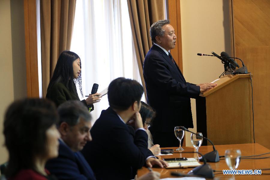 Professor Wu Xiaoqiu (R), vice president of Renmin University of China, addresses a forum themed "Belt and Road Initiative - The New Silk Road" in Piraeus, Greece, on Dec. 10, 2018. Greek businessmen and Chinese scholars voiced confidence in the prospects of Sino-Greek cooperation in the context of the Belt and Road Initiative during a forum held on Monday at Piraeus port, Greece's largest harbor which in recent years has become a strong symbol of win-win bilateral cooperation between the two countries. (Xinhua/Marios Lolos)