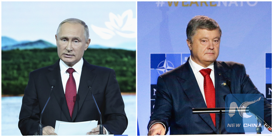 A combination of file photos show Russian President Vladimir Putin (L) and Ukrainian President Petro Poroshenko. (Xinhua)
