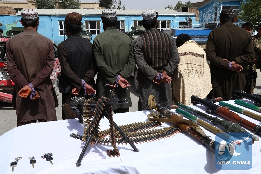 File Photo: Taliban militants stand hand cuffed after being captured by Afghan security force members in Ghazni province, Afghanistan, Sept. 1, 2018. (Xinhua/Sayed Mominzadah)