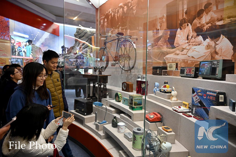 Visitors look at vintage objects displayed at a major exhibition to commemorate the 40th anniversary of China's reform and opening-up at the National Museum of China in Beijing, capital of China, Nov. 15, 2018. (Xinhua/Li Xin)
