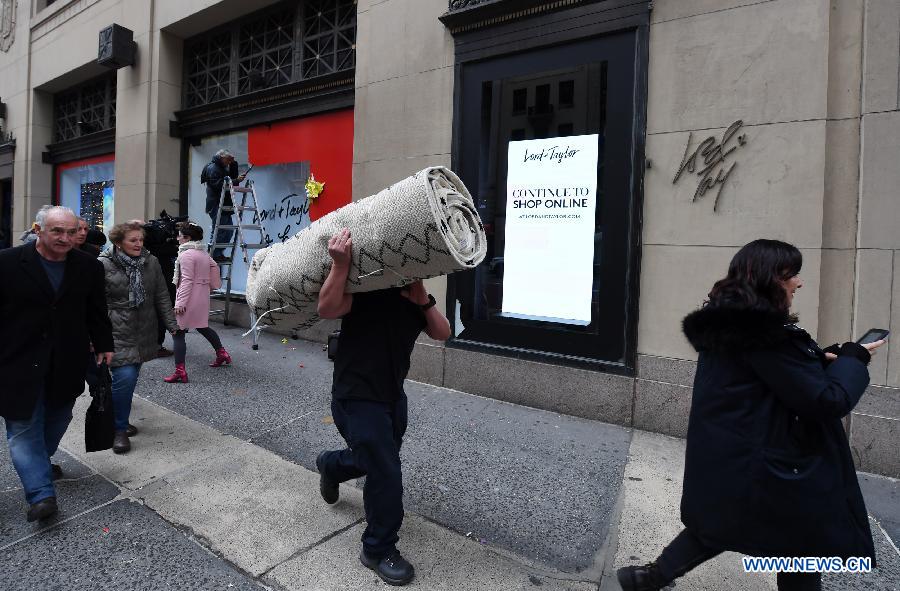 A man carries a roll of carpet out of Lord & Taylor flagship store on Fifth avenue in Manhattan, New York City, the United States, on Jan. 2, 2019. The famous department store chain Lord & Taylor officially closed its flagship store on Fifth avenue in Manhattan. The 11-storey building was a landmark on New York's most prestigious shopping area for over a century, boasting about its animated holiday windows and fine selection of jewelries and clothing and attracting city dwellers and tourists alike. (Xinhua/Li Rui)